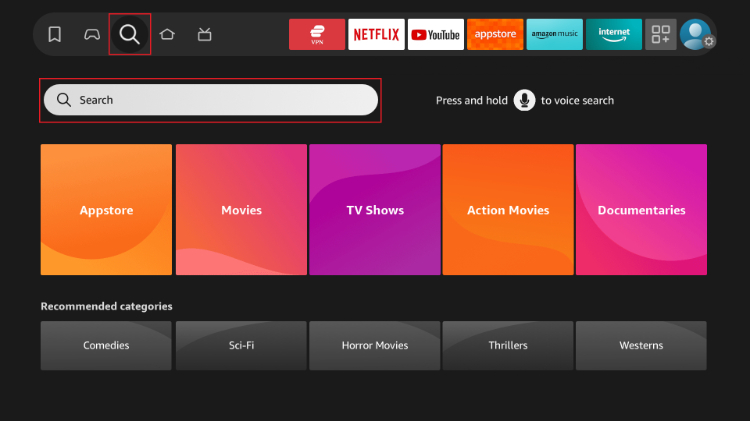 1. Pe ecranul de start al FireStick, derulați complet în stânga pentru a selecta pictograma Căutare (Find). Apoi, coborâți și deschideți Căutare (Search).